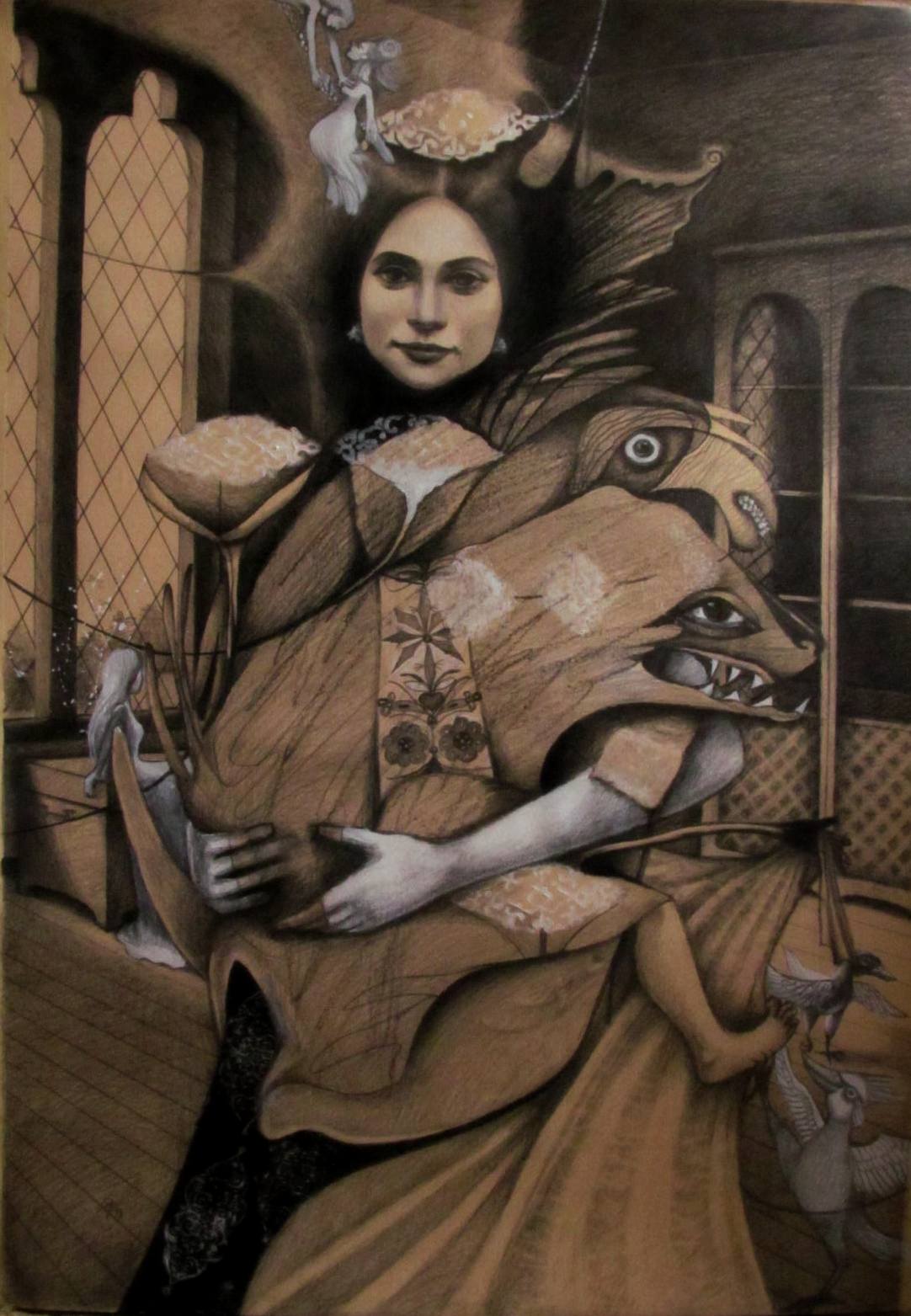 "I have been following Alexandra Geschwandtnerová /1971/ and her artistic development since 2011. Since then, her creation has been constantly developing towards a more sophisticated artistic expression, dominated by imagination, individual mythology and surrealistic interpretation. Her works bring us over to the world of fantasy and dreams. With a routine, brilliant drawing and painting she creates compositions charged with positive energy. She also likes to seek inspiration in the mythology and brings it closer to us through stories in the changing of space and time.